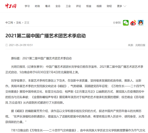 中國廣播藝術團藝術季,是由中國廣播藝術團打造的優質演出精品項目,是在廣電總局領導下以習近平新時代中國特色社會主義思想為指引,積極推進文化創造性轉化、創新性發展的重要實踐,藝術季以優秀的精品力作和高質量的藝術呈現展示新時代國家藝術院團的嶄新風采。