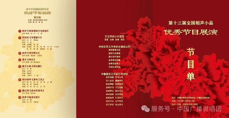 12月3日至5日,由中國(guó)文聯(lián)、中國(guó)曲協(xié)主辦的第十三屆全國(guó)相聲小品優(yōu)秀節(jié)目展演在北京民族文化宮大劇院隆重舉行。在這場(chǎng)匯聚全國(guó)曲藝精粹的盛會(huì)中,中國(guó)廣播說唱團(tuán)以昂揚(yáng)的姿態(tài)和精湛的技藝,交出了一份沉甸甸的年度藝術(shù)答卷。